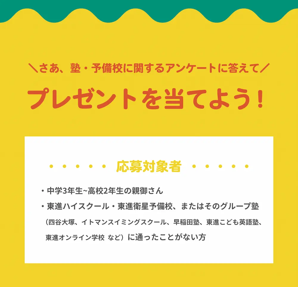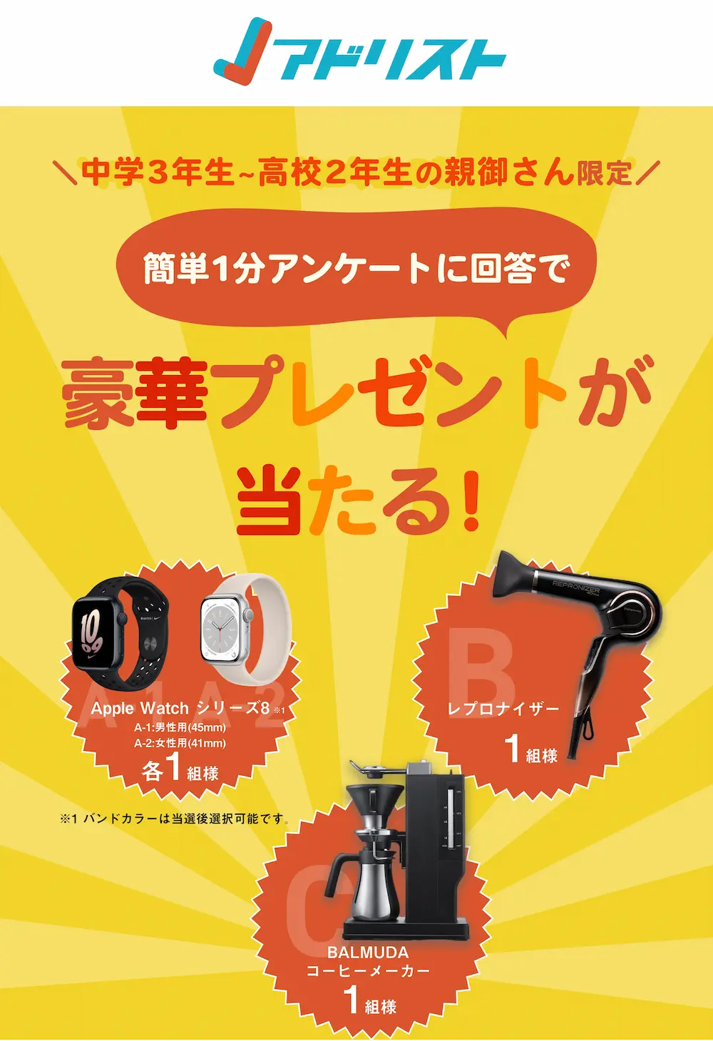 正しく入力されていない項目があります ご希望のプレゼントをお選びください 必須 A-1 Apple Watch シリーズ8 45mm 男性用 A-2 Apple Watch シリーズ8 41mm 女性用 B レプロナイザー 4D Plus C BALMUDA The Brew その他の詳細を入力してください 入力してください メールアドレス 必須 プレゼントの送付に利用します。お間違いのないようにご入力ください 有効なメールアドレスを入力してください 名前 必須 入力してください 名前(フリガナ) 必須 カタカナで入力してください 電話番号 必須 プレゼントの送付に利用します。お間違いのないようご入力ください 半角数字10桁か11桁で入力してください 郵便番号 必須 半角数字7桁で入力してください 住所 必須 プレゼントの送付用に利用します。お間違いのないようご入力ください 入力してください お子さまの学年 必須 中3 高1 高2 その他の詳細を入力してください 入力してください 合格者と不合格者の差がつくのは高2・高1であると知っていましたか? 必須 知っていた 知らなかった その他の詳細を入力してください 入力してください 共通テストで英語の単語数や数学I・Aのページ数が増えていると知ってましたか? 必須 知っていた 知らなかった その他の詳細を入力してください 入力してください 東進は難関大現役合格実績が日本一だと知ってましたか? 必須 知っていた 知らなかった その他の詳細を入力してください 入力してください 有名講師陣でテレビでも話題の東進に興味はありますか? 必須 興味がある 少し興味はあるが具体的な検討はまだしていない 興味がない その他の詳細を入力してください 入力してください 規約に同意する 必須 ■キャンペーン期間 2022年12月1日〜2023年2月28日 ■プレゼント賞品 ・Apple Watch シリーズ8 45mm 1名 ・Apple Watch シリーズ8 41mm 1名 ・レプロナイザー 4D Plus 1名 ・BALMUDA The Brew 1名 ■注意事項 ・本キャンペーンのご参加は一世帯一回限り有効とさせていただきます。 ・本キャンペーンへの参加状況に関するお問合せについては回答いたしかねます。 ・アンケート回答において発生するインターネット通信料・接続料はお客様のご負担となります。 ・本キャンペーンは、キャンペーン期間内であっても、システム障害その他の理由でキャンペーンを中止若しくは停止する場合がございます。 ・アクセス集中や通信回線の状態による遅延、不具合などにより本キャンペーンページへのアクセスや登録・表示などができないことにより発生した損害、または起因して発生したすべての事象につきましては、原因の如何によらず一切の責任を負いかねますので、あらかじめご了承ください。 ■プレゼント賞品の当選発表・発送について ・応募締め切り後厳正なる抽選をおこない、当選発表は賞品の発送をもってかえさせていただきます。 ・賞品の発送は、キャンペーン終了から2か月以内を予定しております。やむを得ない事情により発送が遅れる場合がございますので、ご了承ください。 ・同一人物による重複当選が発覚した場合には、ご登録が先に完了しているものを有効とし、それ以外は無効とさせていただきます。 ・ご入力いただきました情報に入力不備がある場合、又は連絡不能などの理由により賞品がお届けできない場合は、当選の権利を無効とさせていただきます。 ・賞品発送後の事故等に関して当社は責任を負いません。 ・当選の権利を第三者に譲渡することはできません。 ・賞品のお届け先は日本国内に限らせていただきます。 ・当選結果に関するお問合せには回答することはできません。 ■当社におけるお取り扱いについて 取得した個人情報につきましては、以下の目的で利用するほか、当社の定めるプライバシーポリシー(https://alli.tokyo/privacy-policy)に従って取り扱いを行います。 A)当選のご連絡及び賞品発送のため B)メールマガジン及びおはがき等による当社及び当社パートナーの商品、サービス等のご案内のため C)その他上記利用目的に付随する目的のため ■第三者への情報提供について ・当社は、以下のとおり第三者に対し情報提供いたします。 提供先:株式会社ナガセ ②提供する情報:ご回答いただいた情報の全部または一部 ③提供先における情報の利用目的:無料サンプルのご送付やサービスのご案内、その他「個人情報保護方針 (プライバシーポリシー)」(https://www.toshin.com/privacy/)に規定されている目的 ④提供の方法:電子データにより提供 ■お問い合わせ先 アドリストサポート メールアドレス:info@alli.tokyo 受付時間:午前10時~午後6時(土日祝日を除く) ※お問合せから返信まで2日程度お時間をいただきます 18歳以上であり、上記事項(第三者への情報提供含む)に同意します 過去にお子さまが東進及びグループ(四谷大塚、イトマンスイミングスクール、早稲田塾、東進こども英語塾、東進オンライン学校 など)に通っていたことはありません その他の詳細を入力してください 今回のアンケートは通っていたことがない方のみが対象となりま